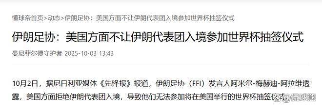 早在今年3月,《》就曾报道过伊朗国家队可能面临无法进入美国参加世界杯的风险,原因在于伊朗公民普遍面临“禁止进入美国”的限制,无法获得签证,这为他们能否顺利参赛蒙上了一层阴影。如今,几个月过去,国际足联似乎仍未找到有效的解决方案,而美国方面也似乎在全力阻止伊朗入境,这使得伊朗队参加世界杯的前景充满了变数。