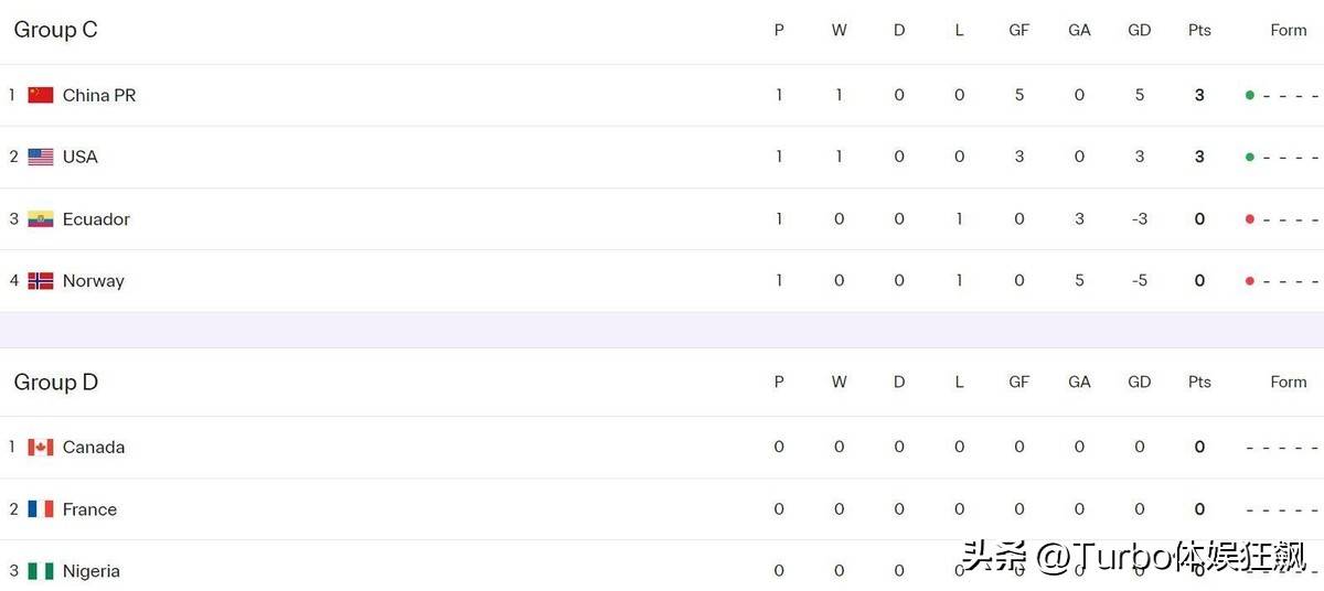 朝鲜女足作为上届冠军,展现了王者风范,开局3分钟就闪电破门,最终2-0轻取墨西哥。美国女足虽然3-0完胜厄瓜多尔,但因净胜球劣势屈居中国队之后。