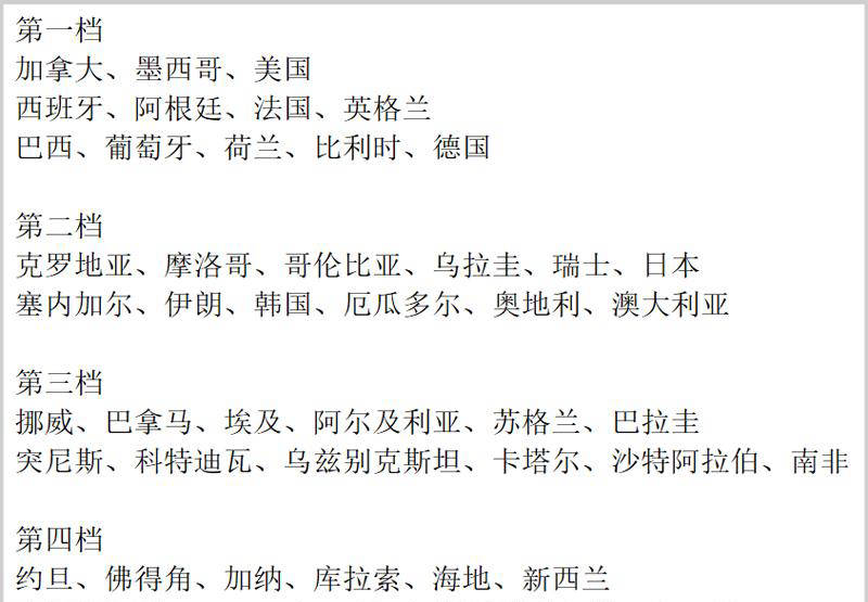 第三档则囊括非洲五支球队:埃及、阿尔及利亚、突尼斯、科特迪瓦和南非,欧洲的挪威和苏格兰,亚洲的乌兹别克斯坦、卡塔尔和沙特,此外还有来自北美的巴拿马和南美的巴拉圭。值得一提的是,乌兹别克斯坦是首次获得世界杯参赛资格。挪威坐拥进球如麻的超级前锋哈兰德,堪称此档次头号热门;苏格兰和挪威虽不算绝对强队,却具备搅局潜质,往往能带来意想不到的惊喜。其余队伍虽然整体实力有限,短期突破较难,但也具备可能爆冷击败更强豪门的潜力。