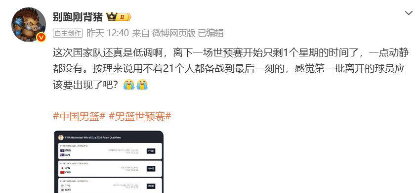 对于中国男篮来说,此次世预赛的重要性不言而喻。在上一轮比赛窗口中,中国队连续两场负于韩国队,遭遇两连败,目前以0胜2负的成绩位列小组第三,而日本和韩国则分别取得两连胜领先榜首。这意味着中国队若想保住世界杯参赛资格,接下来对阵日本和中国台北的两场关键战役必须全力以赴拿下胜利,否则很可能提前被淘汰出局,失去晋级希望。
